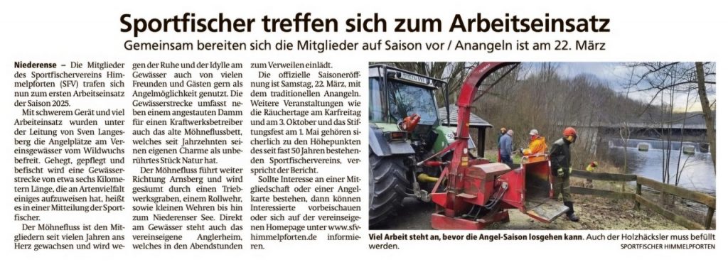 Mehr als zwanzig Sportangler trafen sich zum traditionellen Anangeln des Sport-Fischer-Vereins (SFV) Himmelpforten in Niederense. Bei guten Wetterbedingungen ging es um 8.00 Uhr ans Gewässer und die Ruten wurden ausgeworfen. Hier zog Daniel Behrensdorf eine Forelle von 63 cm aus dem Wasser, die 2.200 Gramm auf die Wage brachte und ihm damit den Tagessieg bescherte. Den zweiten Platz sicherte sich Matthias Kleine mit drei Forellen und einem Gesamtgewicht von 1.420 Gramm. Auf den Plätzen drei und vier landeten Michael Pape und Meinolf Hagedorn mit jeweils einer Forelle (800 und 550 Gramm). Im Anschluss wurde bei Reibeplätzchen und dem ein oder anderen Kaltgetränk der erfolgreiche Saisonstart noch einmal Revue passiert.