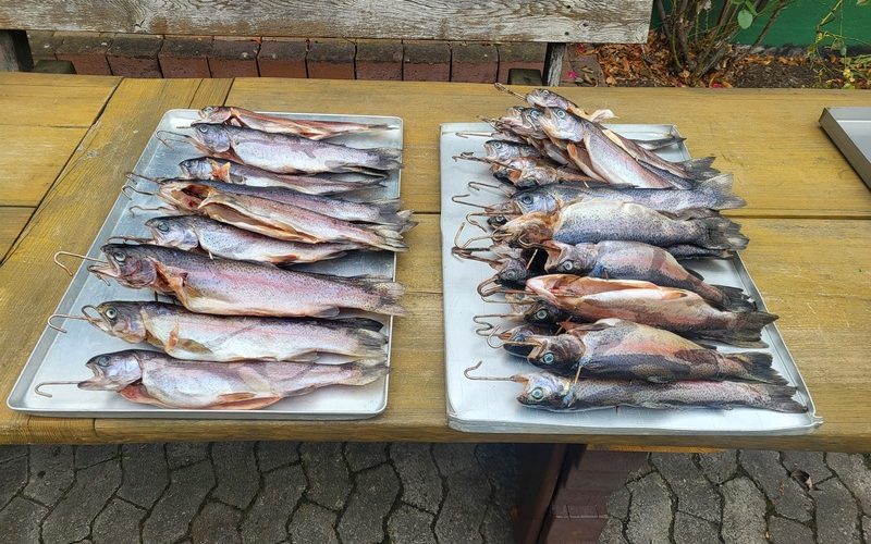 Am Tag der Deutschen Einheit gab es wieder frisch geräucherte und ungeräucherte Forellen für die Bratpfanne. Um pünktlich um 11:00 Uhr die Fische ausgeben zu können, trafen sich unsere fleißigen Helfer bereits am frühen Morgen am Vereinsheim, um mit dem Räuchern zu beginnen. Trotz des kühlen Wetters verlief das Räuchern reibungslos und die zahlreichen Freunde des guten Geschmacks erhielten pünktlich ihre vorbestellten Fische. Die Räuchertage am 03. Oktober und am Karfreitag sind seit Jahren ein fester Bestandteil in unserem Terminkalender und werden von den Fischliebhabern auch über die Enser Grenze hinaus sehr gut angenommen.